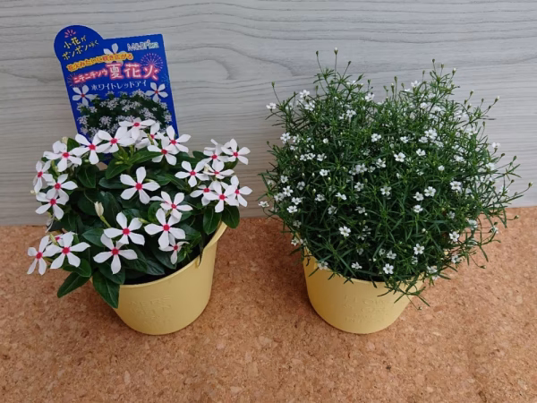日々草 夏花火ホワイトレッドアイのポットとジプソフィラ(矮性カスミソウ)ポットのをクリームイエローのメッセージポットに入れたものと、ご好評頂いておりますヒマワリ🌻入りのの3個セットになります。