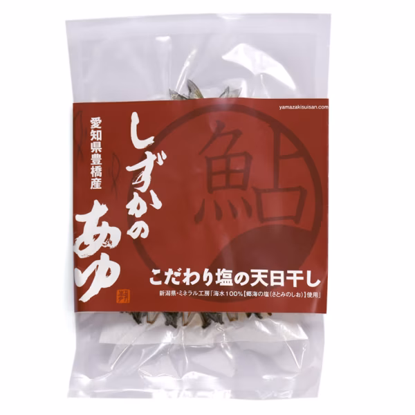 新鮮な鮎を捌き、こだわりの「ミネラル工房」郷海の塩使用して天日干しした山崎水産自慢の干物です。