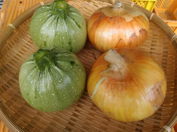 こちらの商品では、丸い形のズッキーニ(緑色)が2個と、大きなサイズの新玉ねぎ2個をセットにしてお届けします。