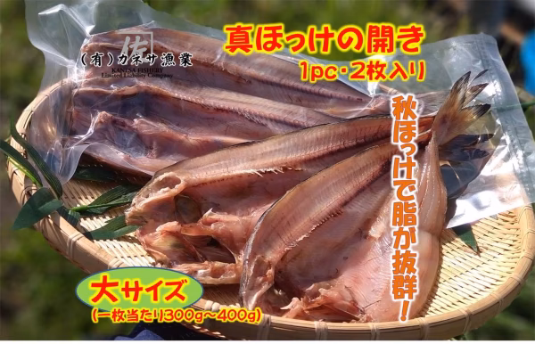 - 名 称:漁師手作りホッケ開き 原材料名:真ホッケ(寿都産)、海洋深層水 内容量:1pc2枚入り 製造者:(有)カネサ漁業 販売者:(有)カネサ漁業 賞味期限:欄外に記載 連絡先:北海道寿都郡寿都町字美谷237-11