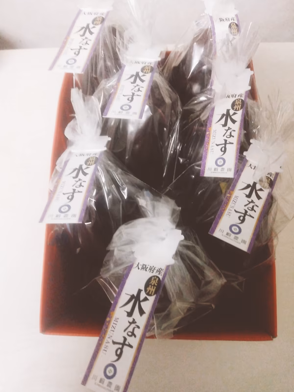 2019年G20 oskaサミット晩餐会の2品目鱧と泉州水なすのお椀に、食材泉州水なすを提供した川崎農園の水なすです。