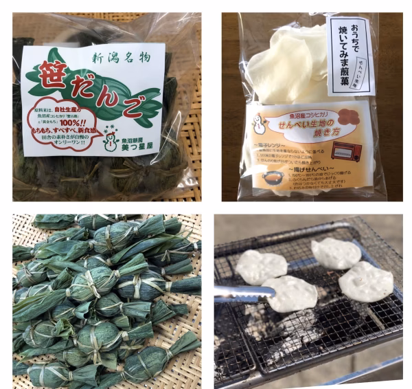 原料米には自社生産の魚沼産コシヒカリとこがねもちを使用。しこしこ、なめらかぁ〜でもっちもち♪の食感が自慢です。