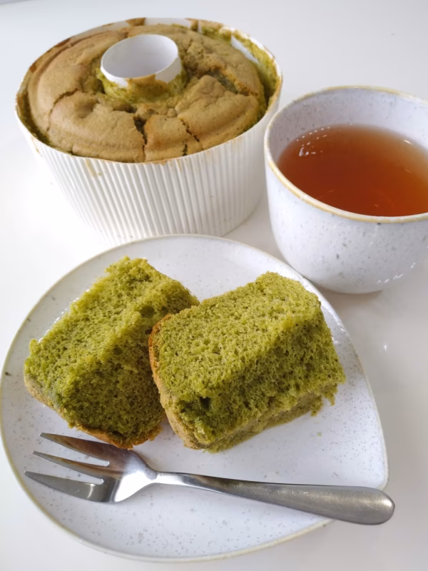 今年度は在庫が少なく抹茶自体の販売を行っておりませんが、地元でこだわりのパンやお菓子を作っている方にこの抹茶を使い、抹茶のシフォンケーキを作っていただきました!!