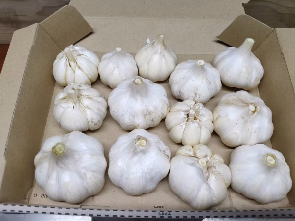 無農薬で育てたにんにく宅急便コンパクトの箱に入る量10〜13個、約950g入れます。写真のように皮を剥いてるものも混じります。