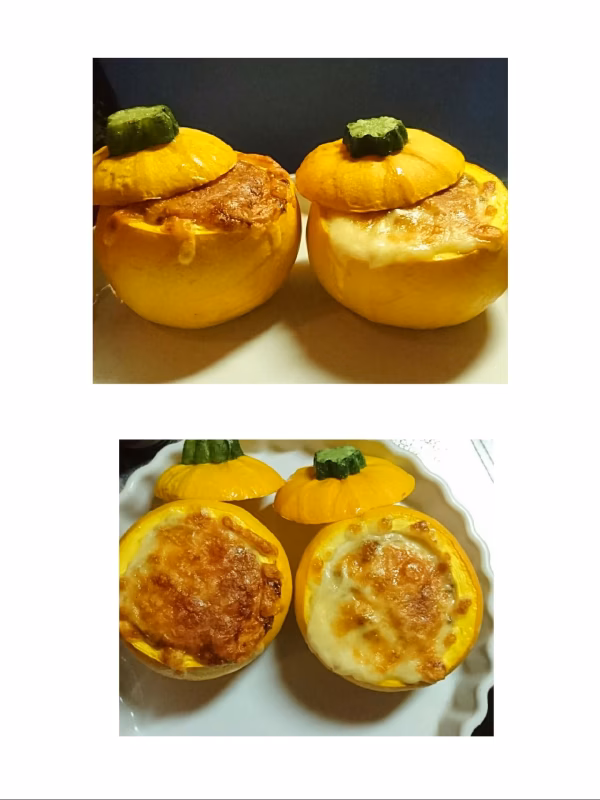 黄色くて丸いかわいい形のズッキーニ(ゴールディ)。中身をくり抜き肉を詰めてチーズを乗せたらオーブンへ!蓋も食べちゃいます😋簡単ですよ!