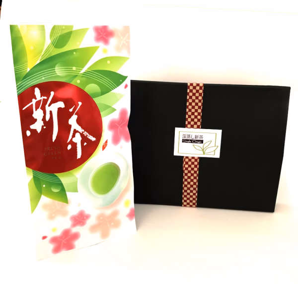 茶園アウラで4月下旬に摘み取った新茶です。毎年4月27日前後に摘み取られています。プレゼント用ケース(220×158×25)mmに入っています。