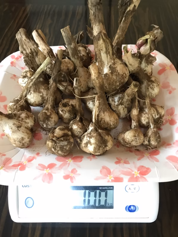 青森県田子町から昨年仕入れて育てた「福地ホワイト6片」生ニンニク。
