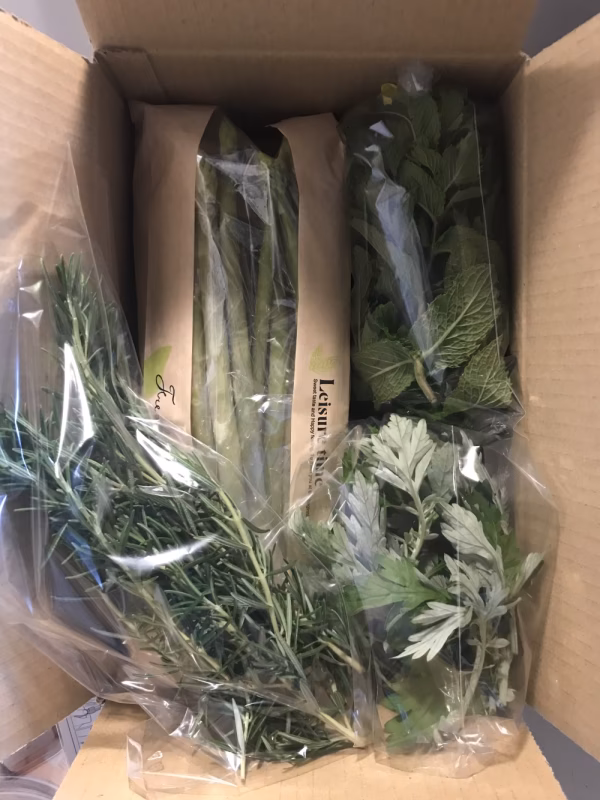 アスパラガス1kgと緩衝材の代わりにハーブをお入れします。ハーブ類は栽培中農薬不使用です。