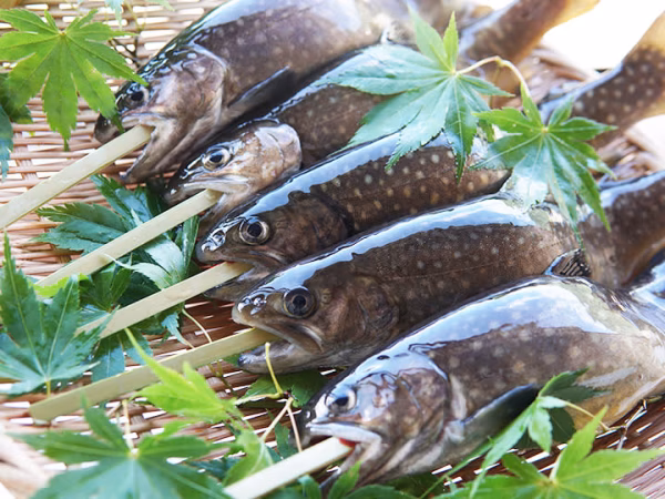 使用している魚は自社養魚場で卵からじっくり愛情を込めて育てた岩魚(イワナ)です。長い年月、研究に研究を重ね、品質を極めました。当場は冬になると例年積雪2m以上にもなり夏でも水が冷たい北陸石川県の山間部にあります。山の清らかな天然水で育てた岩魚は川魚特有の独特な臭みや癖が少なく、とても食べやすいのが特徴です。かぶりつくと香ばしく、ホクホクとした身をお楽しみいただけます。
