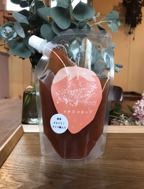 「美味しい時期の完熟イチゴ」をたっぷり使いシロップにしました。体に優しい甜菜糖、オリゴ糖を使い、添加物は一切使用していません。