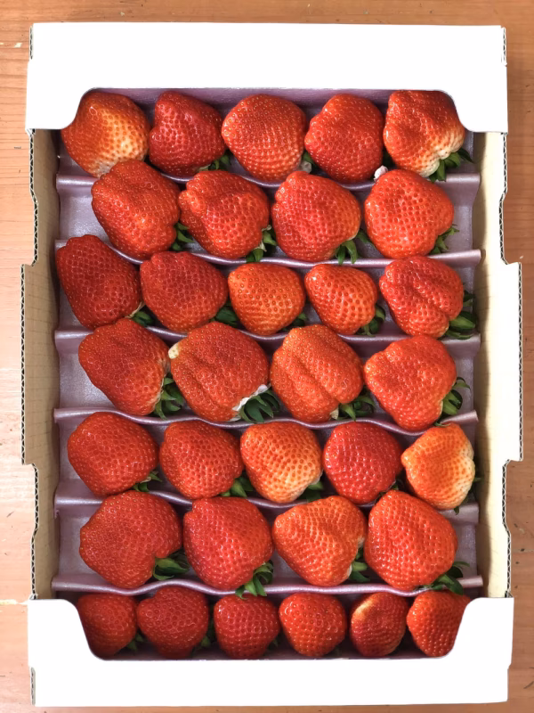 1箱で800gのイチゴを詰めております。輸送時にイチゴが傷まないようにイチゴ型のトレーを使用してお送り致します。