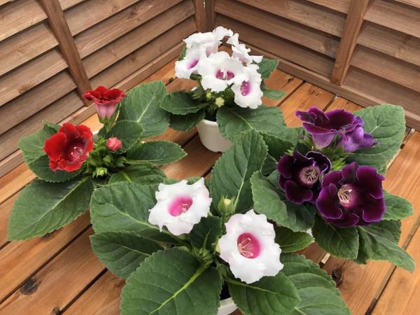 本出品は、食品ではなく花卉の出品です ▼自己紹介 1年を通してシクラメンを主体にいろいろな種類の鉢花や花壇苗を生産いている長谷部園芸です ▼商品概要 一輪が大きく見た目も美しいグロキシニアです 5号鉢での販売になります ▼数量、サイズ 5号鉢 高さ30cm前後 4鉢入 配送中の傷みを防ぐために透明なビニールで包んで配送いたします。到着したら取り外してください 7種類ある花の色から4鉢をミックスで発送いたします