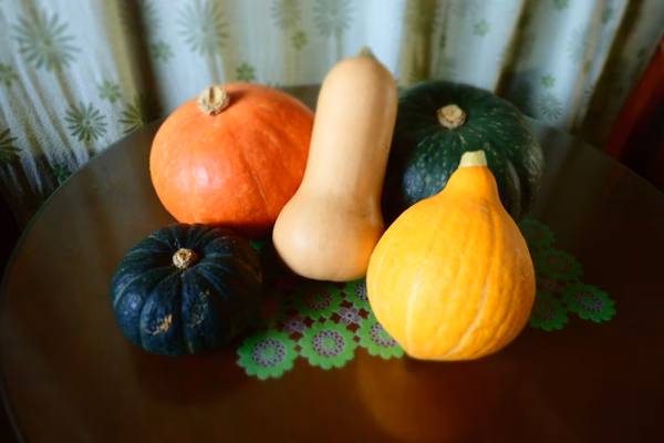 坊ちゃん:手のひらサイズのほくほく系南瓜。丸ごとレンチンしてワタと種をとって肉詰めやグラタンなど小ささを活かしたレシピがお勧め。