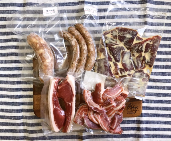 猪肉、鹿肉をスライス、ソーセージなど、色んな形で楽しめるよう散りばめています。