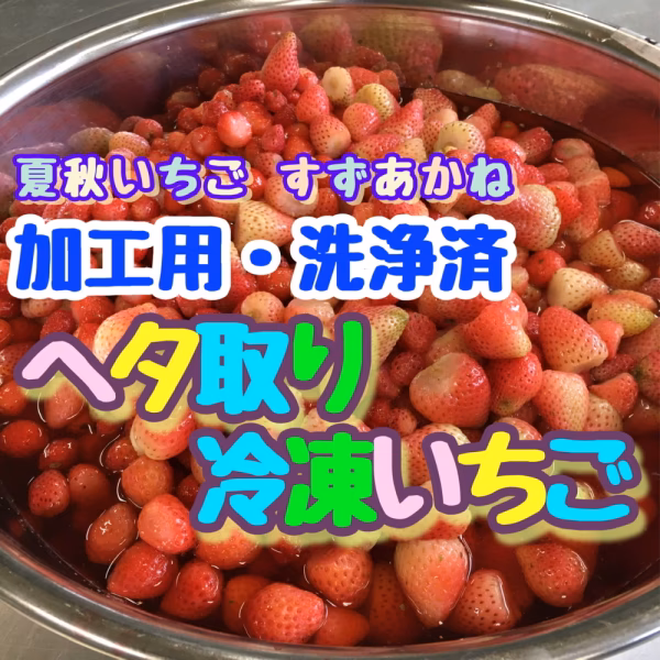 夏秋いちご(品種:すずあかね)を選果・洗浄後、ヘタを取り、1kgずつ冷凍用チャック袋に詰めて冷凍しています。
