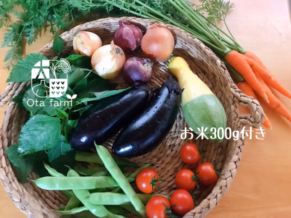 80サイズの箱に5〜8種類の旬のお野菜とお試しサイズの戸ヶ野のこしひかり300g(2合)をセットにしてお届けします。