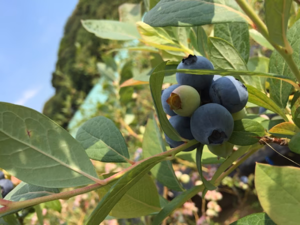 当園のブルーベリーは土を使わない水耕栽培を取り入れており、露地で500本栽培しています。