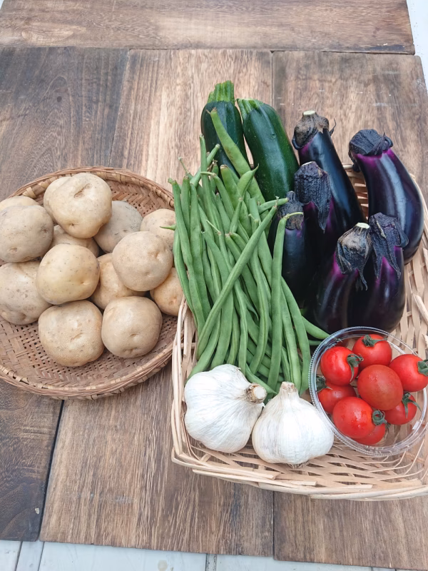 - ジャガイモ、ニンニクは直射日光は避け、常温にて保存してください。通気のある乾燥したところが望ましいです。保存状態に気を付けていただければ、1ヶ月はもちます。ただし、湿気が多いと傷みが早いですので、注意が必要です。インゲン、ズッキーニ、トマト、ナスは生野菜ですので冷蔵庫で保存してください。