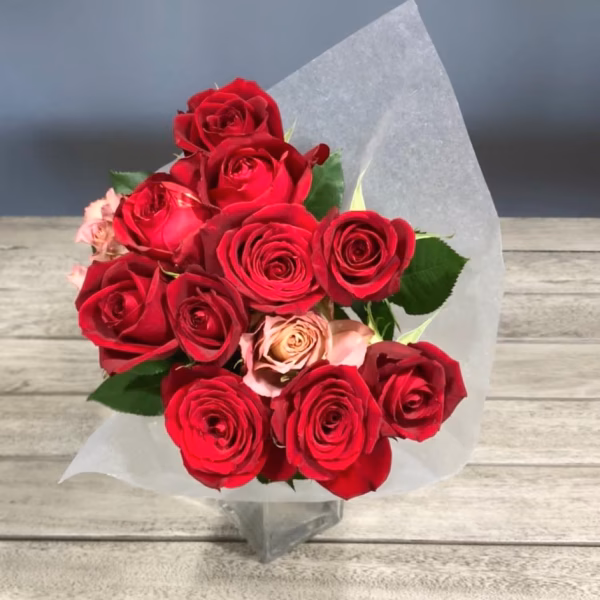 赤系のバラを数品種「12本」をこちらが選んでお届けします。