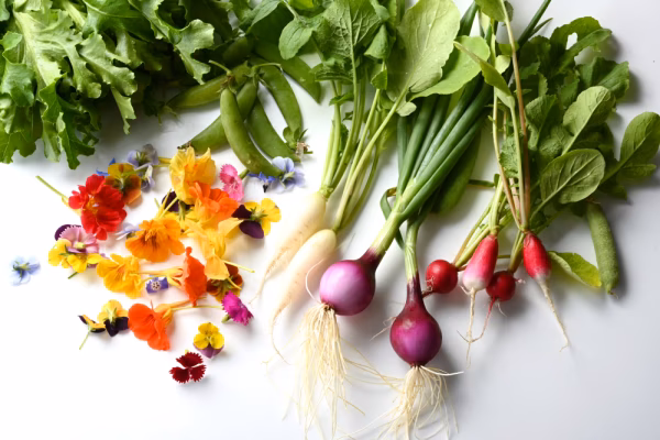 そっと添えるだけで食卓が華やぐ「エディブルフラワー」や、爽やかに香るおすすめハーブ、レア野菜は、小指ほどの大きさの「マイクロキュウリ」、ずんぐりオクラ「オクラヒルカントリーレッド」、白いナス「イタリアン白ナス」、おたふく顔のかぼちゃ「バターナッツ」、「オカワカメ」など。その他加賀野菜の「加賀太きゅうり」「金時草」なども登場します。