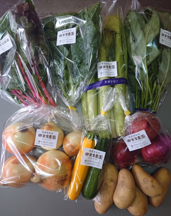 今、路地野菜で旬のじゃがいも、玉ねぎ、ニンニク、空芯菜、ツルムラサキ、スイスチャード、バジル等々の野菜を8種類以上詰め合わせた「野菜ボックス」です。