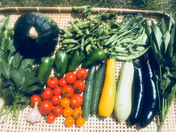 春物と夏物野菜がいろいろ入ってます。現在、内容はミニトマト、中玉トマト、ピーマン、ナス、きゅうり、カボチャ、マクワウリです。