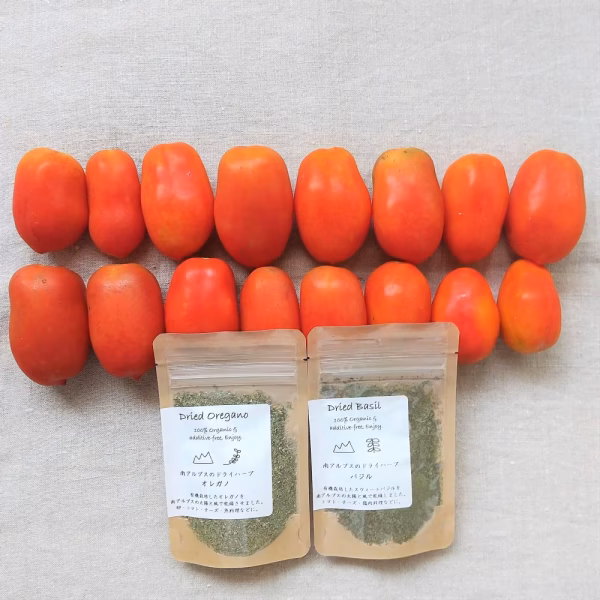 南アルプスのオリーブ畑の脇で、有機JASかつ農薬・化学肥料不使用で栽培したオーガニックトマトと、同じく農薬・化学肥料不使用のドライハーブ2種(バジル・オレガノ)をセットにしました。
