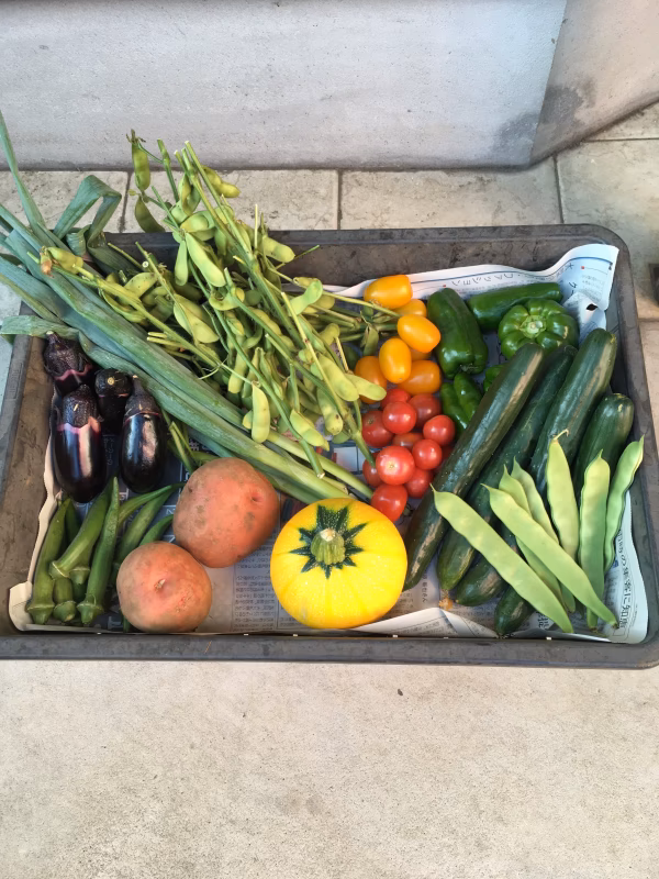 - 1.中身はその都度変わります。 例)完熟ミディトマト、完熟ミニトマト、ブルームきゅうり、なす、ピーマン、サヤインゲン、空心菜、じゃがいも(アンデスレッド)など 2.エコファーマーとは、農薬や化学肥料の使用量を少なくして、人や環境にやさしい農業を行うと認定される農家です。
