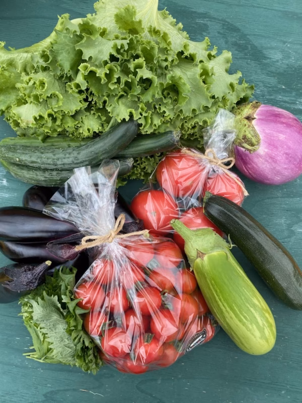 おおよそですが、大玉 2~3玉、ミニトマト 200g、きゅうり 3本、千両ナス 2~3本、ピーマン 3個、イタリアナス 1個、ズッキーニ 1本、青シソ 5枚になります。