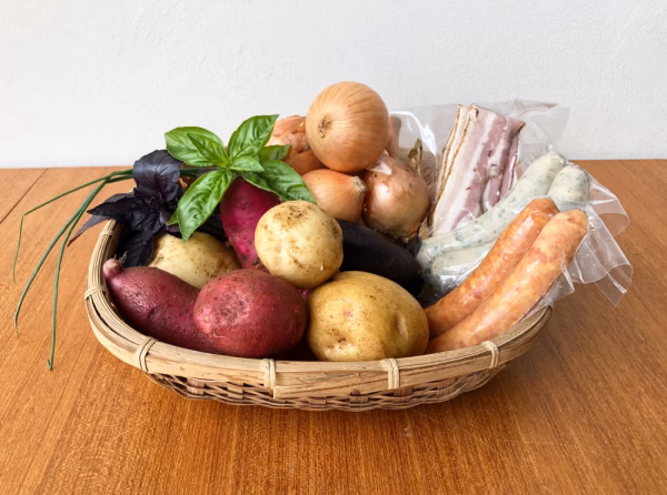 今回は7月に収穫したばかりの個性豊かなジャガイモ10種類の中から5種類のジャガイモと、ソー セージやフレッシュハーブをセットにした食卓の主役になる“カラフルジャーマンポテト”が楽しめるお料理キットをお届けします。