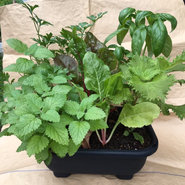 そんな思いから、ハーブとスイスチャードの寄せ植えを作りました。