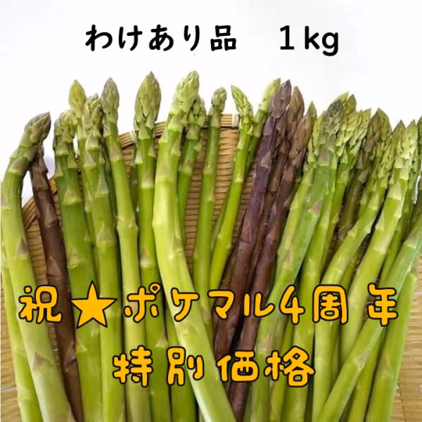 - 祝★ポケマル4周年&アスパラ収穫終了ありがとうの特別価格! 通常1kg1600円のところ、4周年にちなみ1400円にて出品いたします! ※1.5kgの商品は受付停止しております