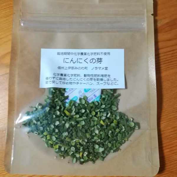 化学農薬、化学肥料、動物性の堆肥、肥料を使わずに栽培したにんにくの芽を乾燥させました。