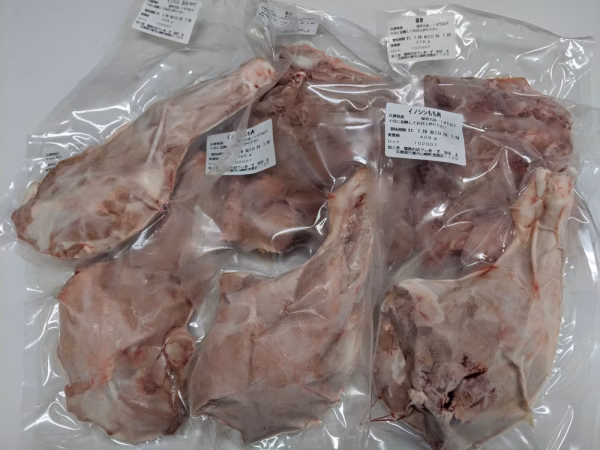 もも肉2本、前足(肩肉)2本、あばら骨(背ロースの部分の肉を付けたラムチョップ型にカットしています)のセットです。