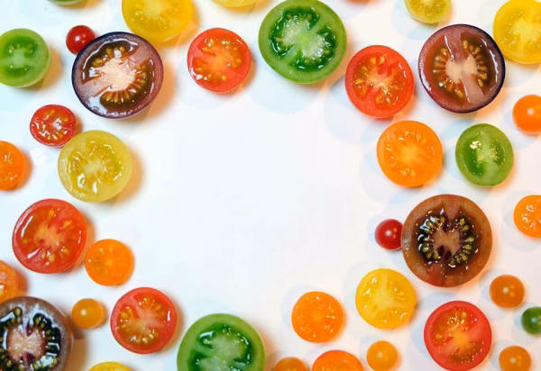 少なめの500g。ミニ系、大玉で24品種栽培している中から10品種以上はいっています。サイズや形も様々☆赤・黄色・オレンジ・紫・緑・ゼブラ柄などカラフルで鮮やか。