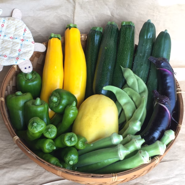 気持ちのいい朝の畑から、ぷりぷり野菜をお届けします。菌ちゃん(微生物)がゆっくり育ててくれた畑の土で、ほんのり甘い、すうっと体になじむ野菜ができました。きゅうり、ズッキーニ、ミニ玉ねぎ、ジャンボししとう、オクラなど、その時その時収穫できたかめっこ野菜セットです。