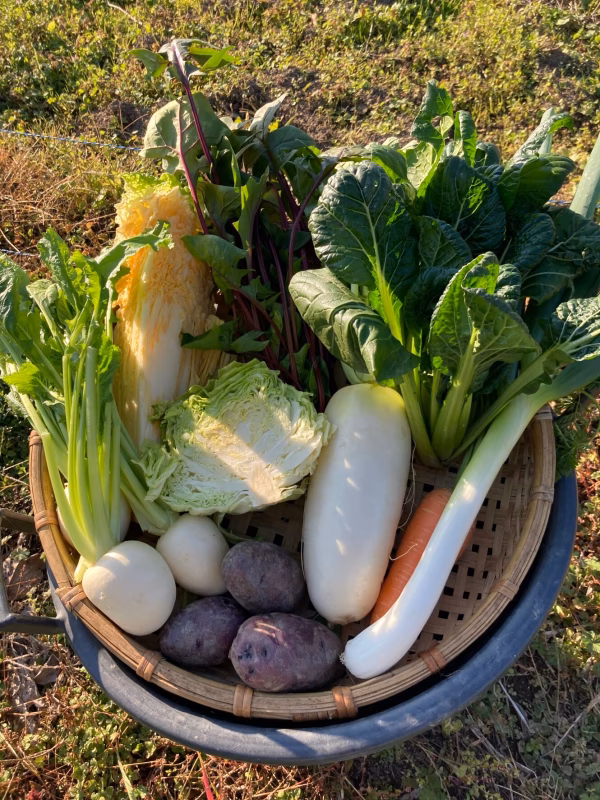 年間60品目を野菜ごとに旬に併合わせて露地で作ってます。基本的にセットの中身は人間の都合でなく、畑にあわせて9-10種類ほど葉物、根菜類をバランス良く入れさせて頂きます。