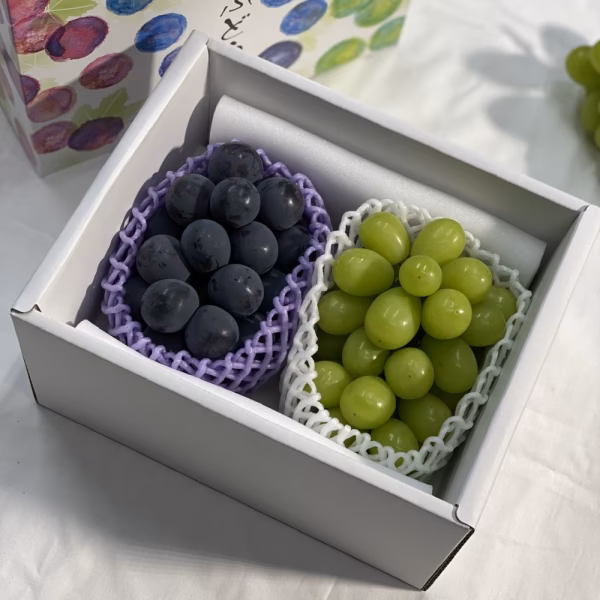 Nini farmで栽培したニューピオーネとシャインマスカットの中でも、標準的な品質なものを1房づつ詰めております。ご自宅用商品ですが、ちょっとしたギフトにも使えるものとなっております。