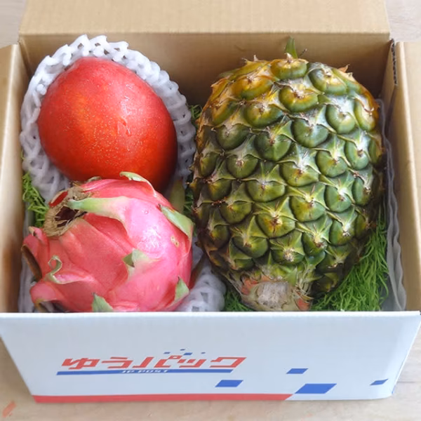 マンゴー、パインは石垣島産です。また、エコファーマー認定を取得した農家で減農薬栽培を取り寄せてセットにしています。ドラゴンフルーツは、沖縄本島で栽培しています。無農薬栽培です。