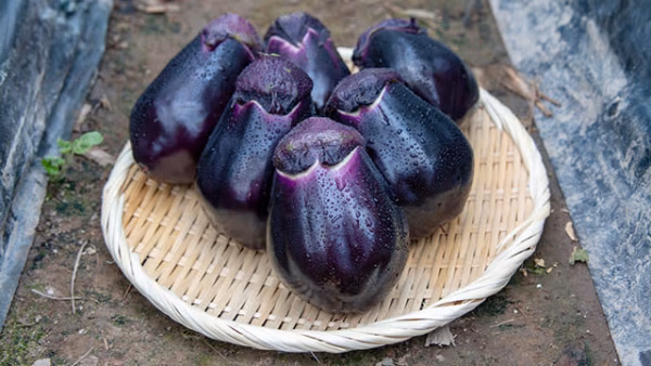 一般のナスに比べてずんぐりとした丸型で、皮が柔らかく、名前のとおり手で握ると水が滴り落ちるほど水分が多いです。