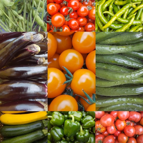 玉ネギ、ジャガイモ(キタアカリ)、キュウリ、ズッキーニ(緑と黄色)、中長ナス、水ナス、米ナス、ピーマン、ミニトマト(赤とオレンジ)、トマト、オクラ、伏見甘長唐辛子、ニガウリ、スイートコーン、枝豆、モロヘイヤ、ニンジン、キャベツ、チマサンチュ、下旬からカボチャ(えびす系)が入る予定です。夏野菜、ガシガシ食べて、夏を乗りきりましょう。