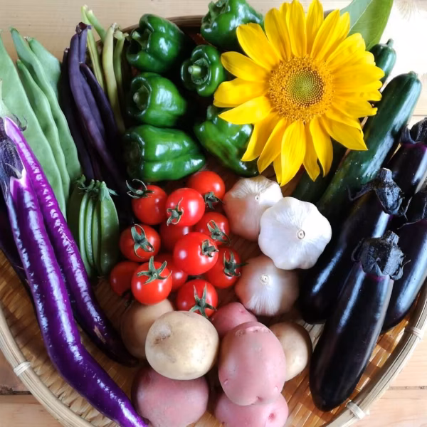 フルーツトマト、ミニトマト、じゃがいも(男爵、アンデスレッド、デストロイヤー、レッドムーンより)ナス、ピーマン、キュウリ、長ナス、ササゲ、キヌサヤ、インゲン、ニンニク、ツルムラサキ、モロヘイヤ、ミョウガなどから3種類以上。