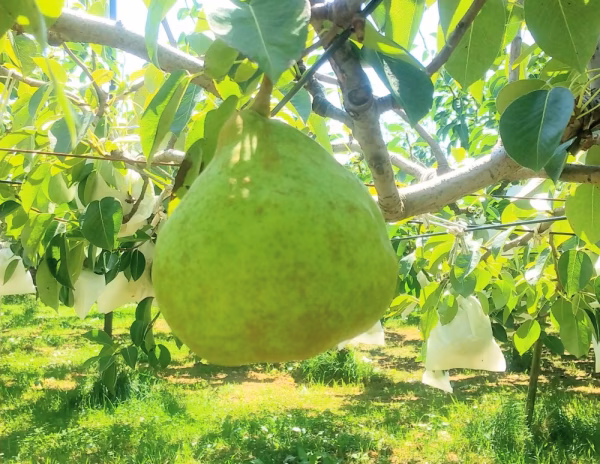 早生種の洋梨、完熟した果肉は果汁たっぷりで柔らかく、舌の上でとろけるような食感が楽しめます。甘みと酸味のバランスもよく、芳醇な味わいです。