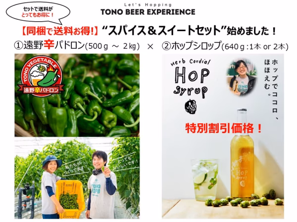 このたび、送料がお得な「スパイス&スイートセット(遠野辛パドロン&特別価格ホップシロップ)」をご準備いたしました!私たちの自慢の商品で皆様の笑顔あふれる豊かな食卓を応援していきます!