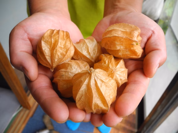 オレンジチェリーって何? ⋯ はい、それは食べられるほおずきなんです。百笑農房のオレンジチェリーは大粒で酸味に特徴があり、酸味と甘味、大人の苦みがほんのり加わり、絶妙なバランスが癖になる味です。