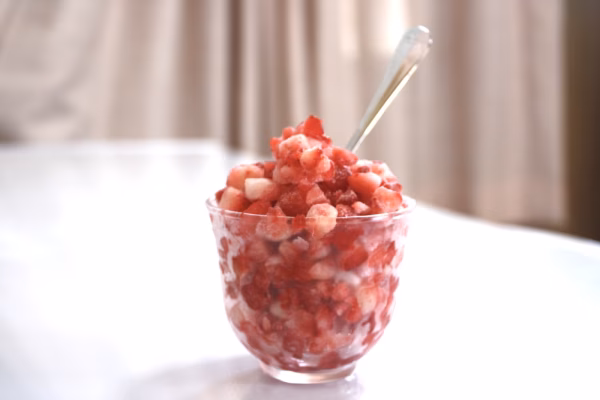 また、コップに「れいとうクラッシュドあまおう」を入れ、あまおうが浸るまでミルクを注ぎ、砂糖もしくはシロップを入れれば、超簡単あまおうフラッペが出来上がります!