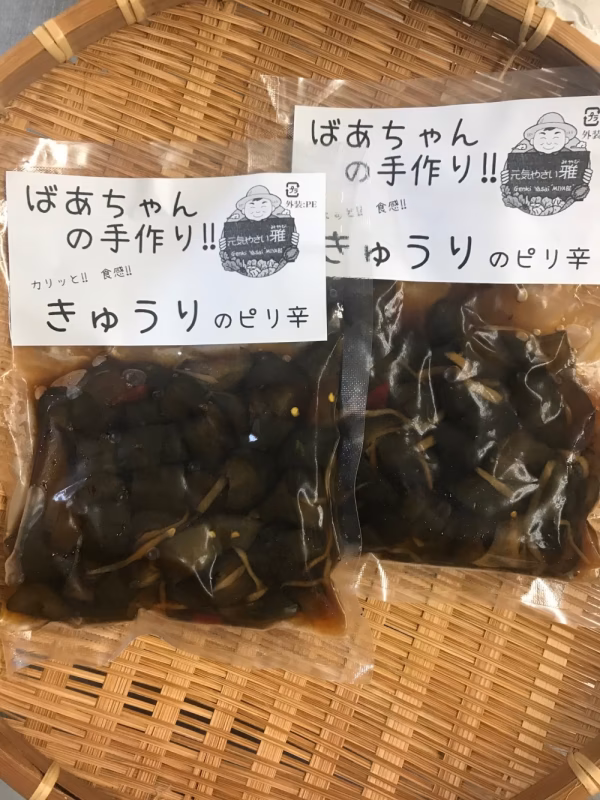 今回はお婆ちゃんたちと一緒に作った『キュウリのピリ辛』・『アジ削りの佃煮』のセットを出品させていただきました。