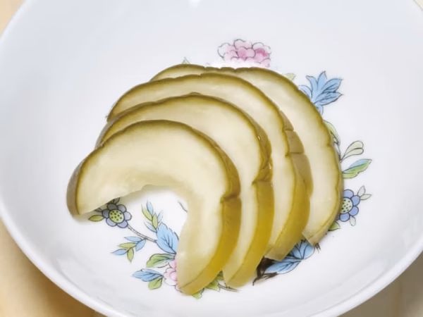 摘果メロンには、高級メロンの品種レノンを使っています。摘果メロンでも果肉がしっかりあり、食べ応えのある漬物に仕上がります。