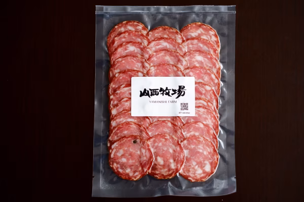 親豚と子豚(通常出荷豚)のモモ肉を半分ずつ使用して製造し、2か月間じっくり熟成した豚100%のサラミです。豚のみとは思えないほどコクがあり、山西ならではのさらりとした脂により口に残る感じもありません。