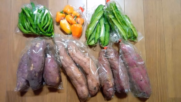 さつま芋は三種類で6〜8本、3㌕程度、その他の天ぷら向け野菜は袋詰で2人前程度。(3〜4種類程)
